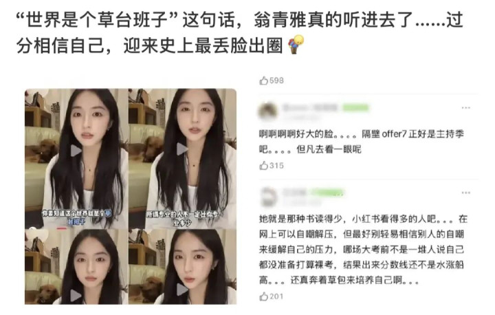 有这样优越的家世和名校光环加持,却如此的缺乏专业素养、礼仪常识,以及过度紧张导致的扭捏也是大众对她失望的原因。