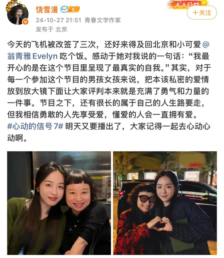 饶雪漫确实很爱她,在《心动的信号》录制期间,多次表达对她的喜爱,