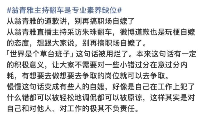 整个过程中翁青雅的状态都很拘谨,看起来完全不懂怎么采访,更别提控场。